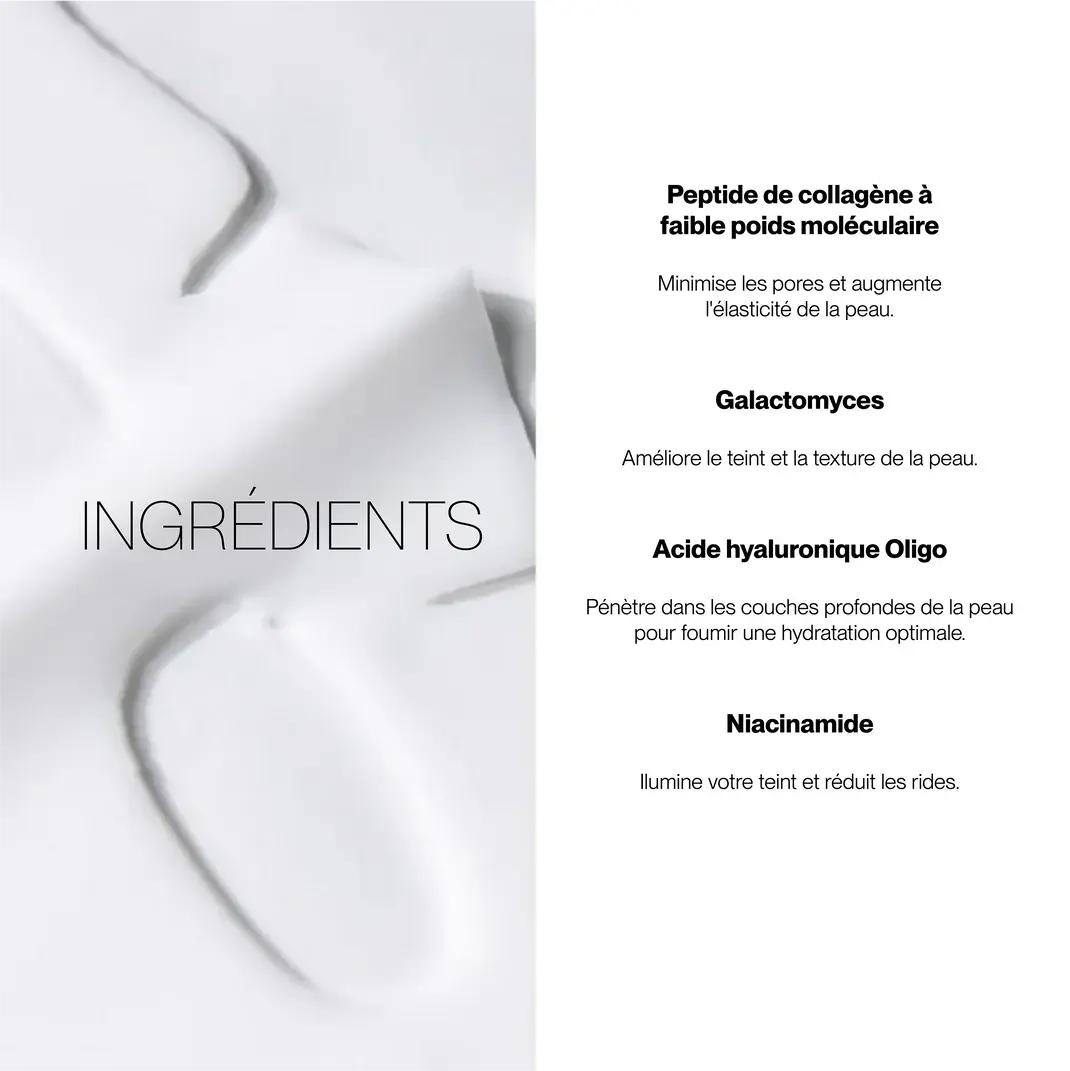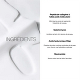 Les ingrédients principaux du masque sont le filtrat de ferment de Galactomyces, l'acide hyaluronique hydrolysé, le collagÚne et niacinamide. Il contient également trois types de probiotiques : le Lysat de Ferment de Lactobacillus, le Ferment de Lactobacillus et le Filtrat de Ferment de Bifida.